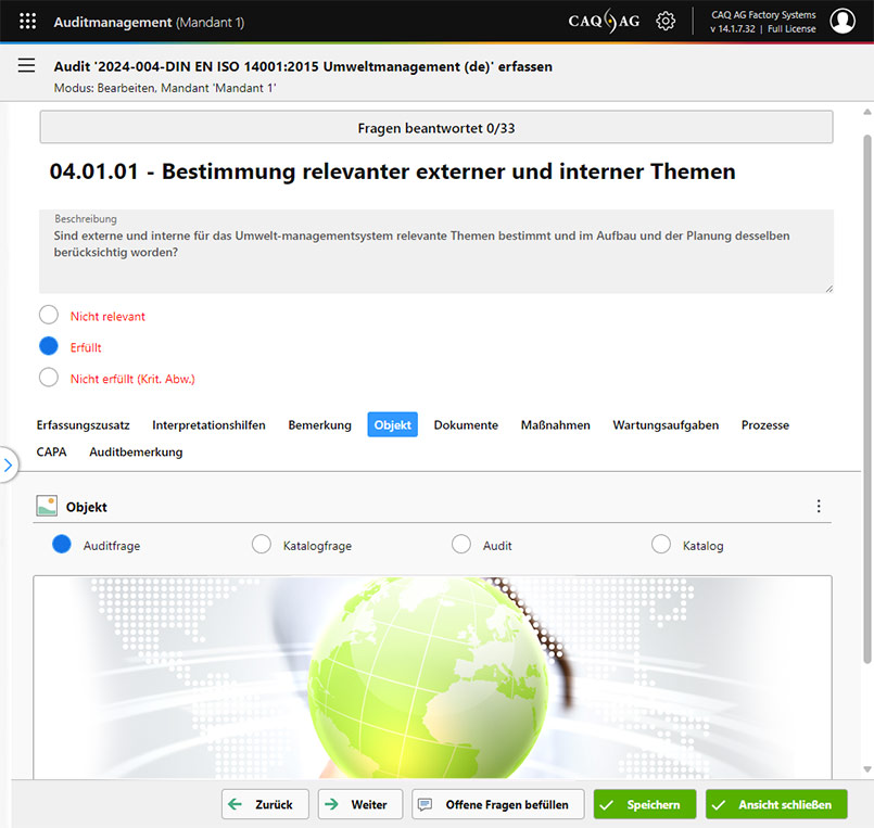 Die Software enthält eine Vielzahl anwendungsspezifischer Standard-Fragenkataloge zu verschiedensten Normen und Richtlinien. Ob ISO 9001, ISO 13485, DIN EN 9100, IATF 16949, VDA, IFS, EMAS, VDA ISA 6.0 (TISAX), Arbeitssicherheit (OHSAS) oder Umweltmanagement: Nutzen Sie mit QAM.Net ein praxisbezogenes und anwenderfreundliches System zur normenkonformen Auditplanung und Auditdurchführung.