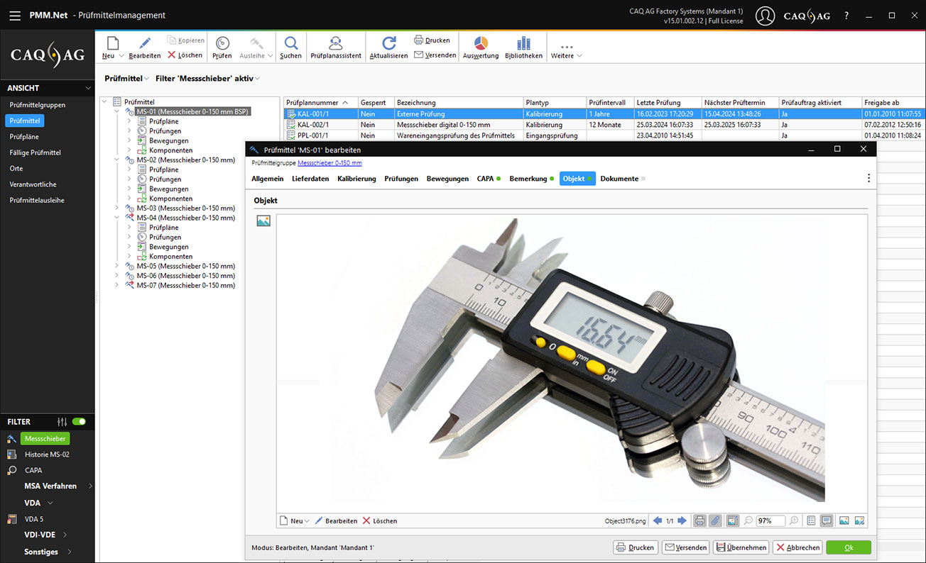Integrierte Prüfplanverwaltung mit Versionierung und Freigabestatus sowie Prüfhistorien und Prüfmittellebensläufe mit Einsatz- & Lagerort
