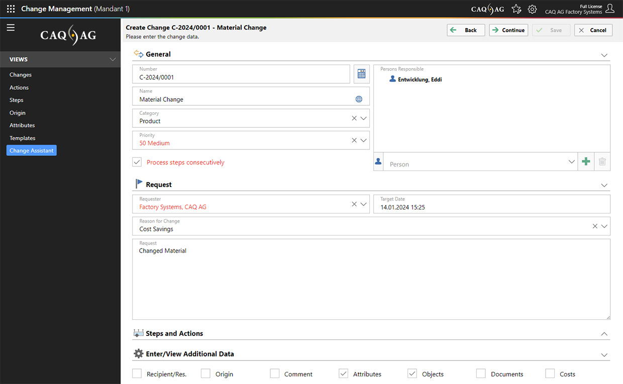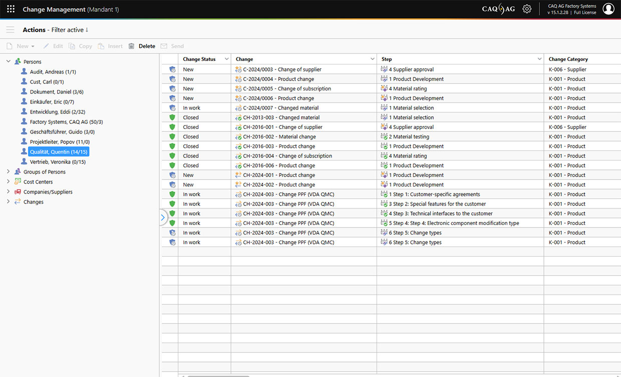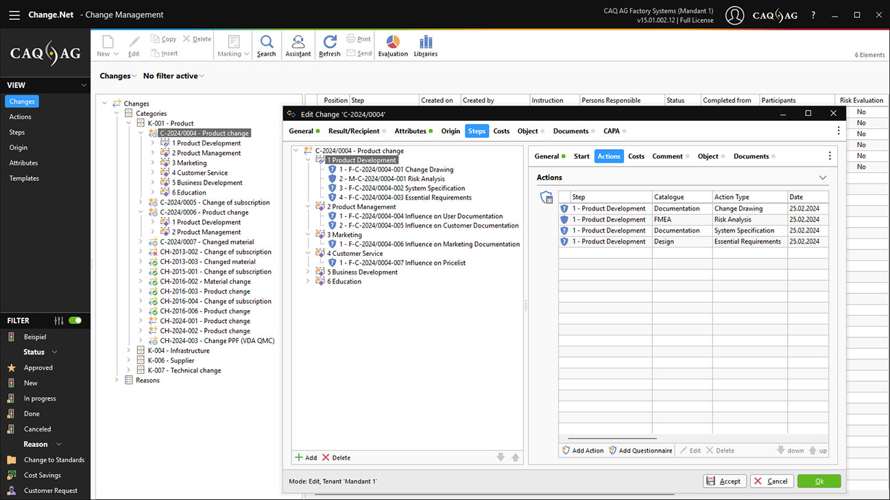 The change control software Change.Net is your solution for centrally controlled and cross-departmental change management. The software is designed to provide a comprehensive overview of all change processes in your company and ensure that modifications made to products and processes are conducted in a controlled, coordinated, and cost-efficient manner. From the minutest screw to the smallest footnote in the product specification sheet or the seemingly unimportant process step at the supplier company: Change.Net makes sure that absolutely nothing is forgotten or overlooked and the quality of your products and services is safeguarded throughout even the most far-reaching change processes in your company.