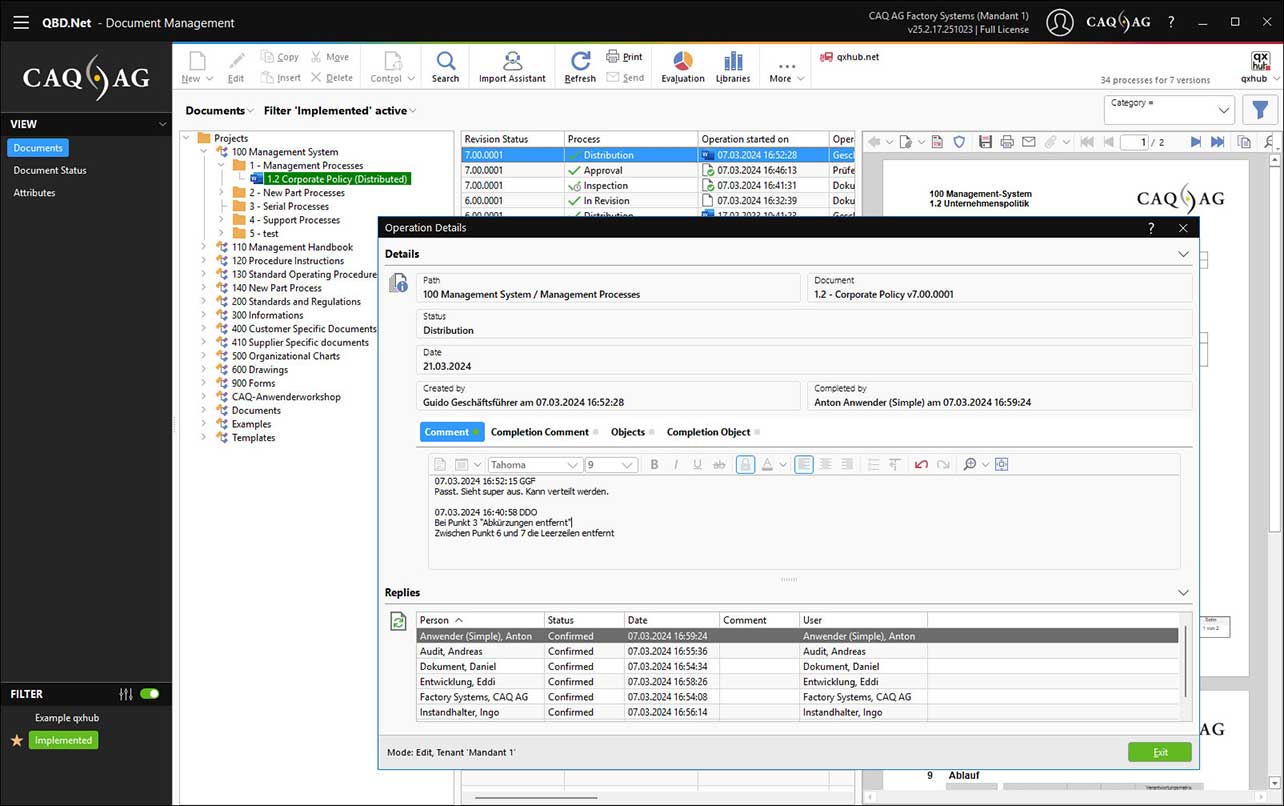 In case of an audit, all documents, versions, and approvals are immediately accessible. Auditors can track who created, reviewed, and approved a document. In addition, audit-relevant records can be generated automatically, saving time and ensuring maximum transparency.