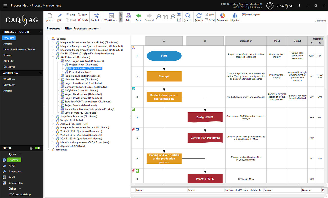 The functional scope of the APQP Software starts with the initial definition and visualization of the product creation process in the Process.Net Process Management Software and extends to the modules for FMEA, SPC, MSA, and PPAP along with the integrated Control Plan Manager for handling the production control plan. Provided with responsibilities, deadlines, and milestones, the individual components of the quality plan can then additionally be monitored in the Projects.Net Project Management Software.