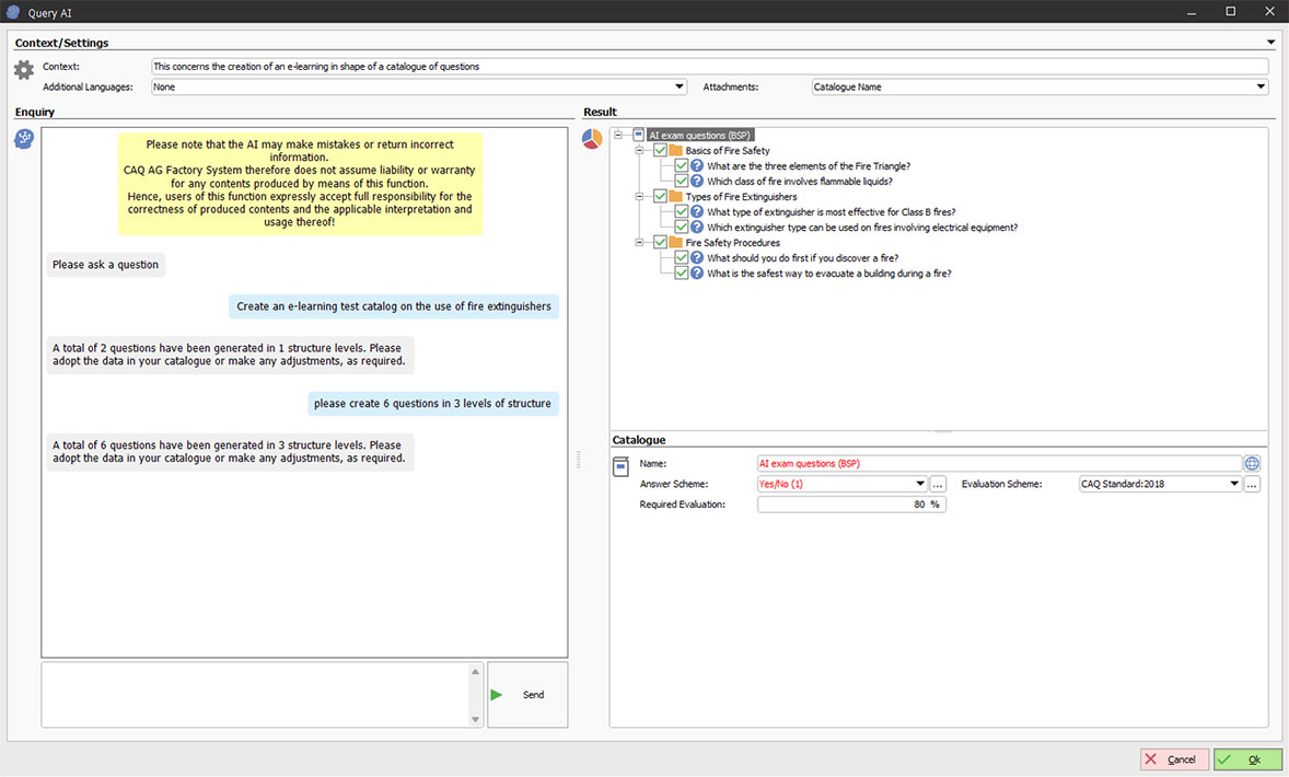 Whether questionnaires in training management, Ishikawa diagrams in complaint management, or audit catalogues in audit management: Use AI as intensively as you need in each specific application to achieve your desired result. Use any prompts you wish, refine the answers provided, and only initiate further actions once you are satisfied with the AI-delivered result.