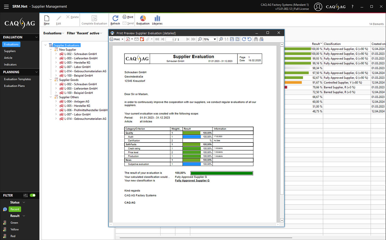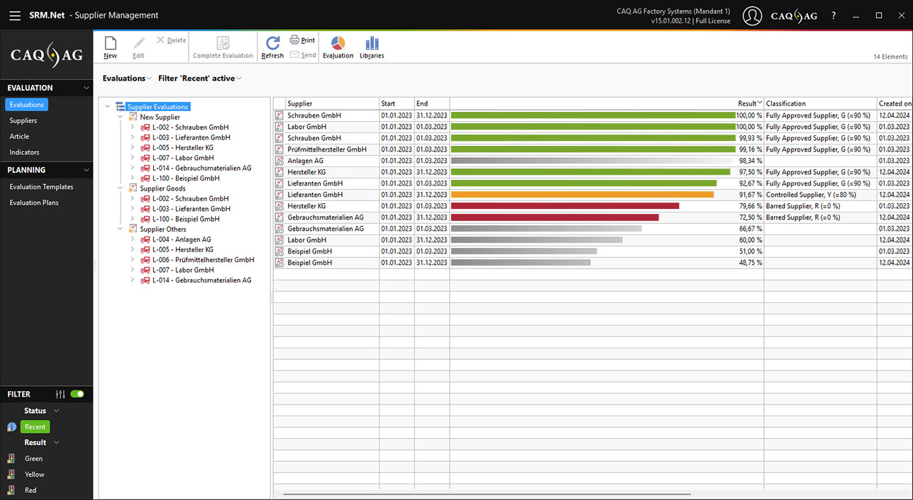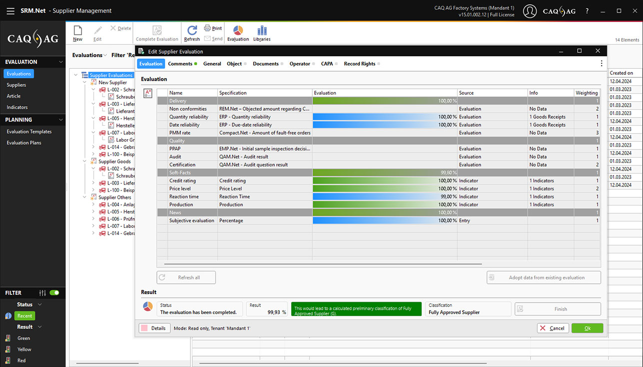 The Supplier Management Software SRM.Net allows you to systematically and effectively manage your supplier relationships. You can apply freely definable evaluation criteria at all levels of the value chain in order to precisely assess suppliers and always choose the most reliable, the cheapest, or the one that supplies the best quality. Regardless of whether you wish to apply existing A/B/C supplier ratings, prefer to use freely definable threshold values, or create your own supplier-ranking methods: SRM.Net provides the utmost degree of flexibility when choosing evaluation methods or decision criteria.